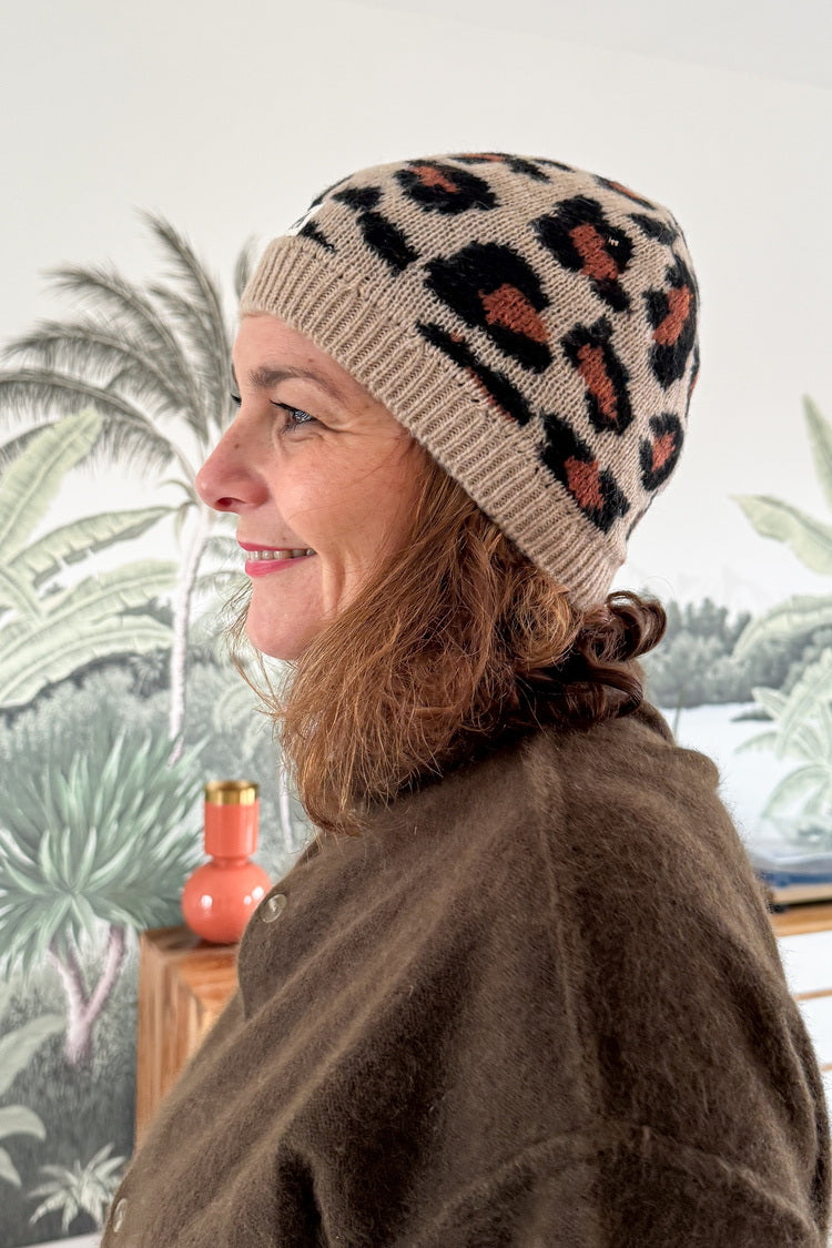 Le bonnet Boris, avec son imprimé léopard beige, sera votre meilleur allié contre le froid tout en apportant une touche de style à vos tenues.