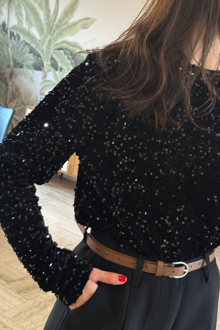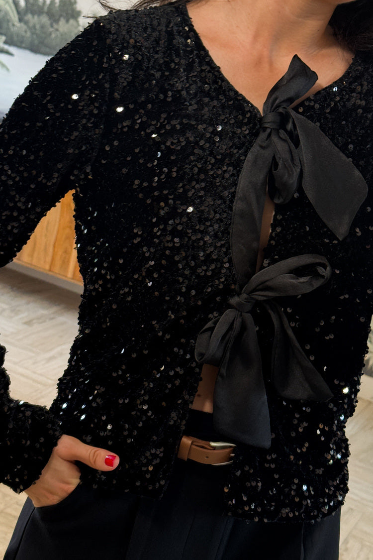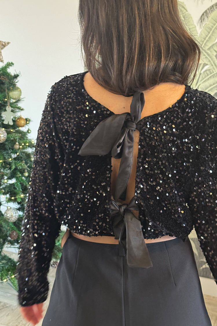 Le top Mélodie est la pièce parfaite pour les fêtes : un haut chic entièrement recouvert de sequins, sublimé par deux grands rubans que l’on peut nouer devant ou dans le dos selon l’envie. Il s’accorde à merveille avec le pantalon Harmonie ou le short Manon.