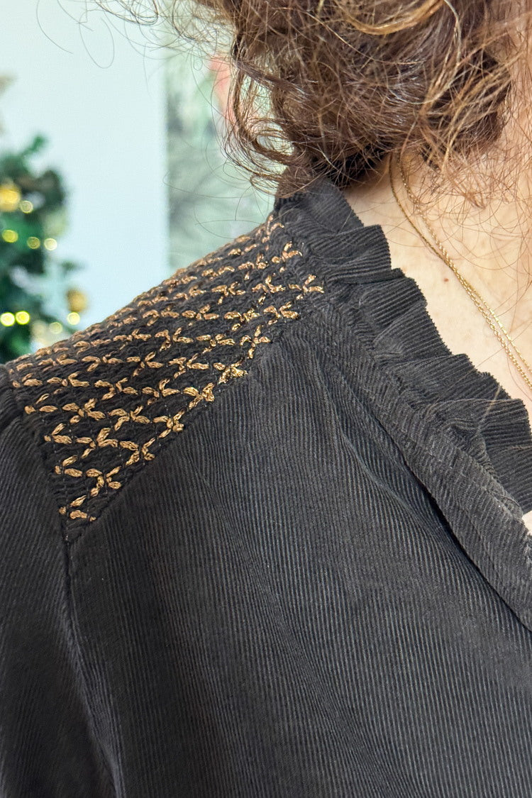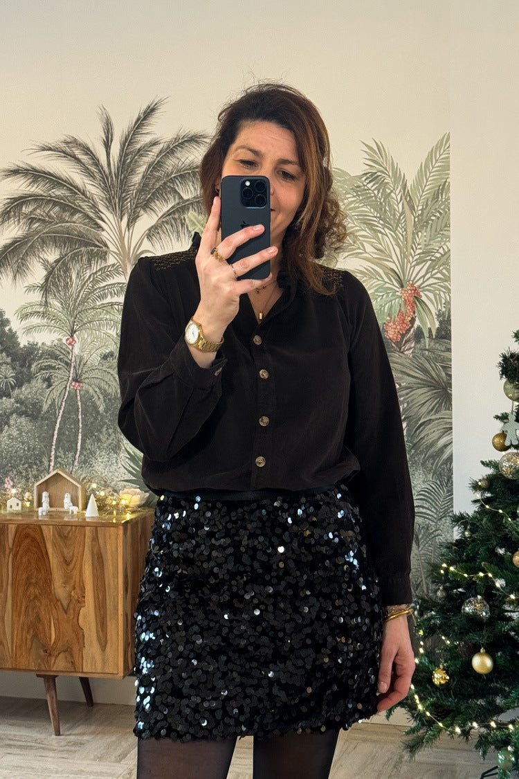 La chemise Sarah, en velours côtelé léger, séduit par ses petits froufrous au col et ses boutons sur le devant. Une pièce douce, tendance et facile à porter au quotidien comme en soirée. On l’associe avec la jupe Ambre à sequins ou le pantalon Harmonie.