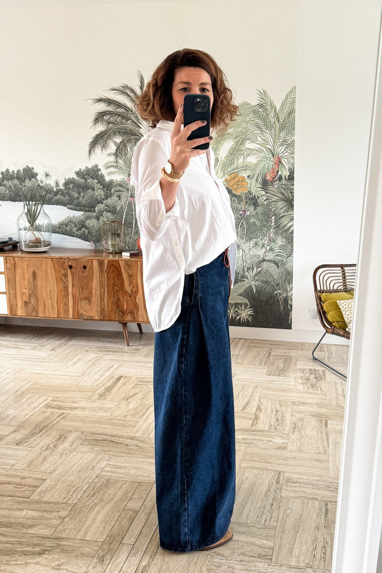 Le jean Grit séduit par sa coupe ample et très évasée, offrant une allure moderne et affirmée. Sa taille marquée structure la silhouette tout en apportant une touche féminine et actuelle. Confortable et stylé, il se porte facilement en toutes circonstances. On l’associe avec la chemise Shana et le gilet Gaelle "From I love" pour un look élégant et plein de caractère.