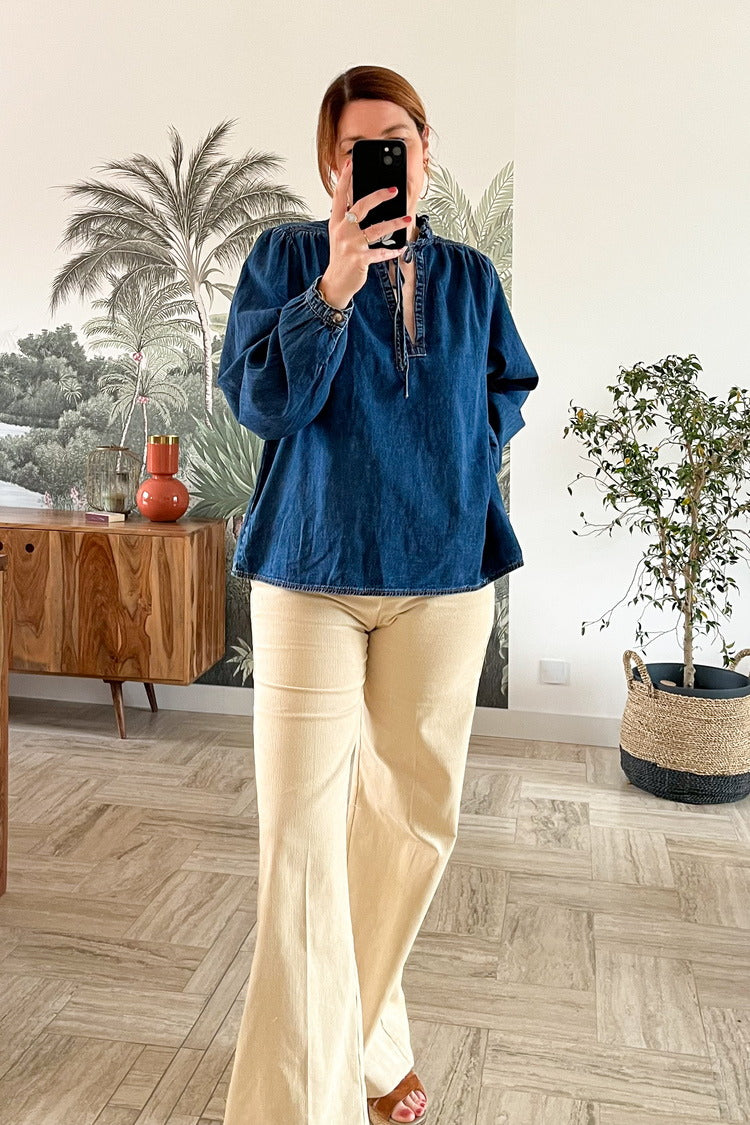 Le pantalon à jambes larges Samba propose une silhouette inspirée des années 70. Le modèle présente des jambes larges, une coupe droite et une taille haute qui subliment les courbes féminines avec élégance. Portez-le avec le T-Shirt Sorentino et à la veste Abélie pour un look casual.