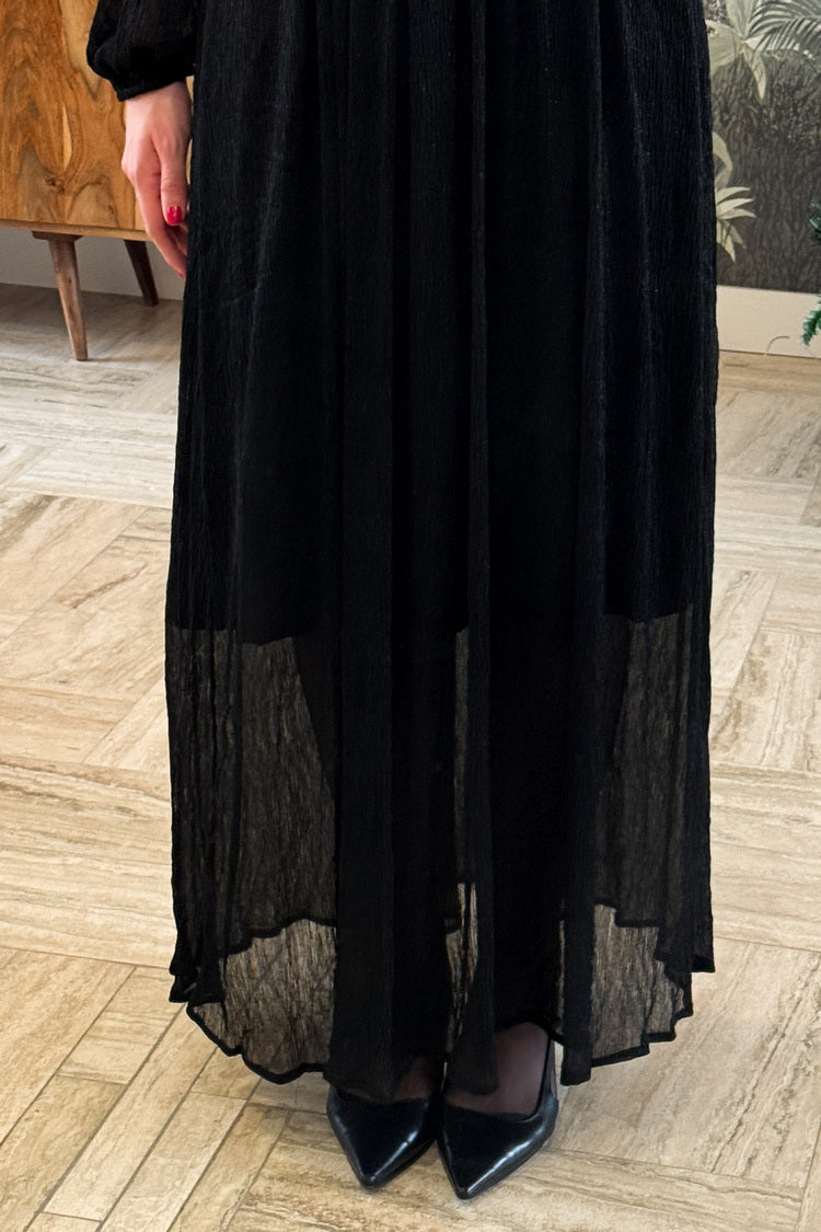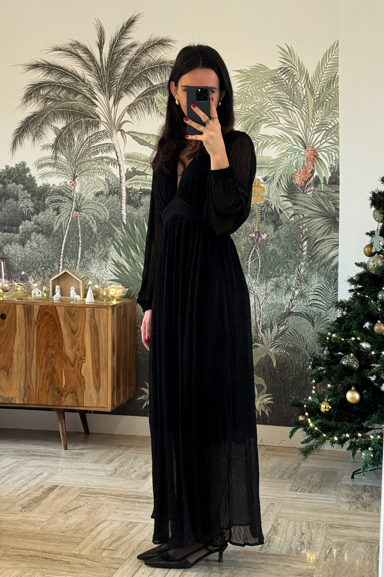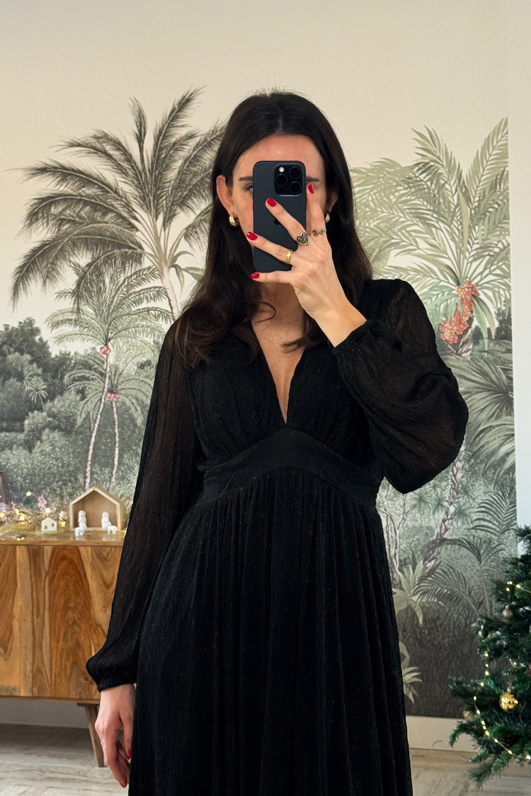 La robe longue Mathilde allie élégance et modernité avec ses manches transparentes et son tissu lurex brillant. Sa taille élastiquée et son col en V subliment la silhouette, tandis que la doublure de la jupe apporte confort et légèreté. Une pièce qui fait scintiller chaque moment festif.