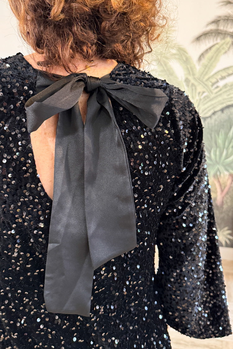 La robe Léa se fait remarquer avec ses sequins noirs scintillants et son ruban XXL dans le dos qui dévoile subtilement votre silhouette. Une pièce audacieuse et élégante, parfaite pour briller en soirée tout en restant confortable et moderne.