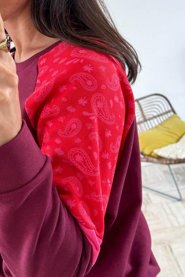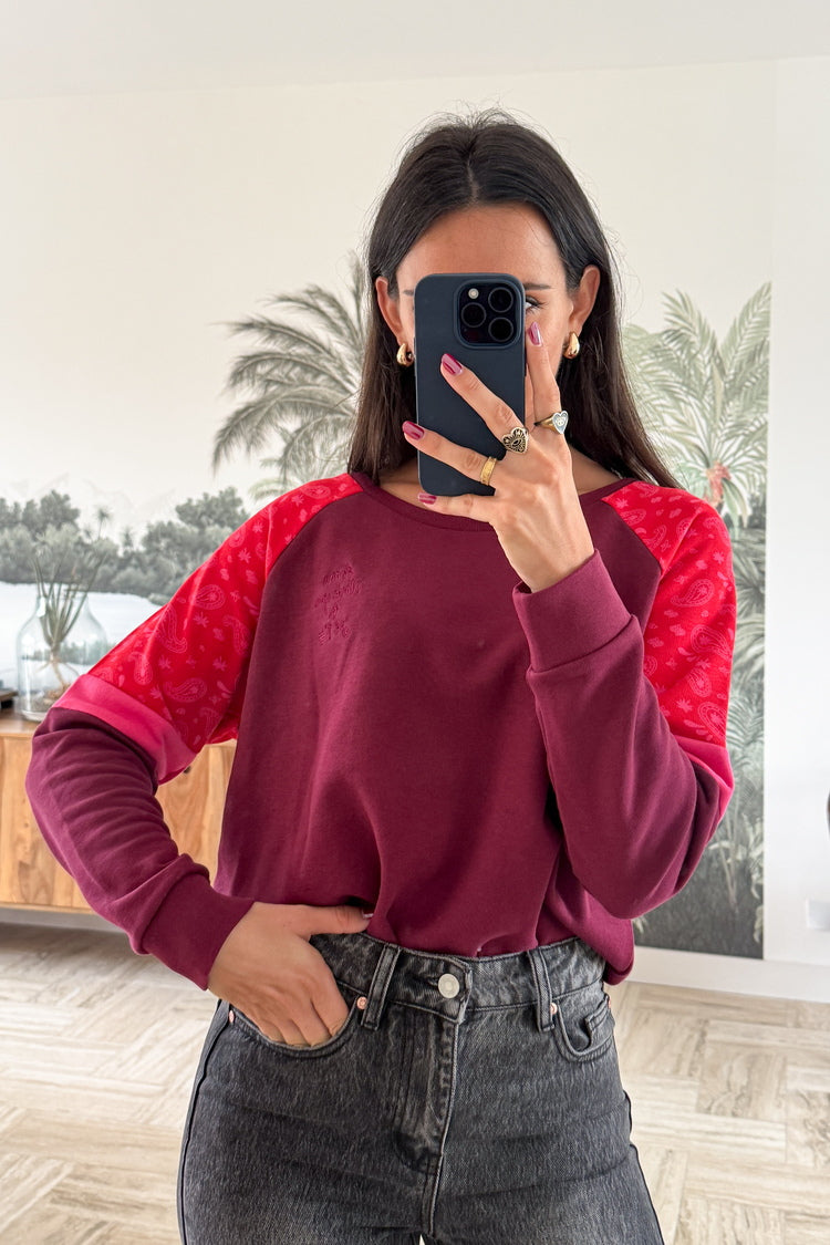 Le sweat Sunshine séduit par son motif cachemire et son jeu bi-Couleur subtil, mêlant un bordeaux uni à des manches rouges imprimées. Une touche féminine qui donne du caractère à ce sweat confortable.