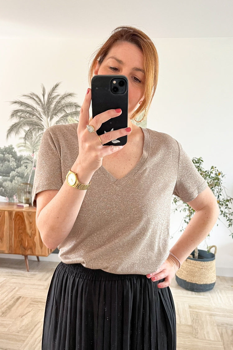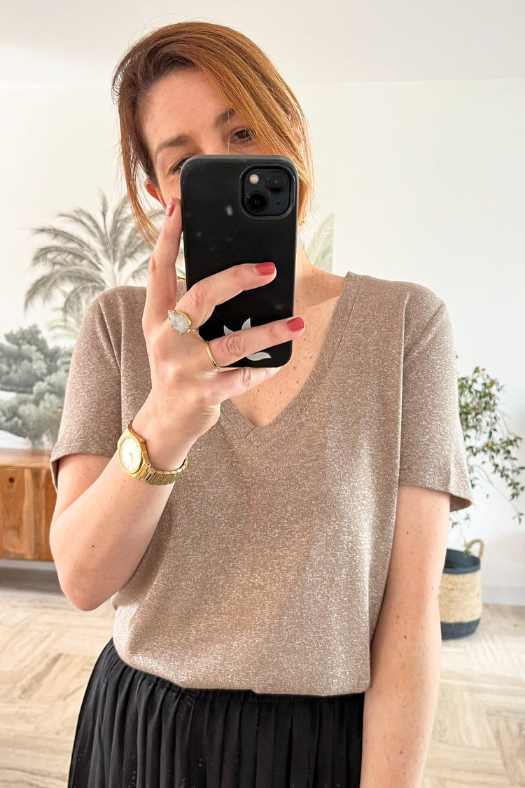 Le top à manches courtes Stardust est confectionné dans un tissu en lurex et s'intègre facilement au vestiaire du quotidien. L'encolure en V et la coupe droite classique, rehaussée par des fentes sur les côtés, subliment les courbes de chaque femme. Le top en lurex Stardust est un essentiel a ajouter à sa garde-robe.