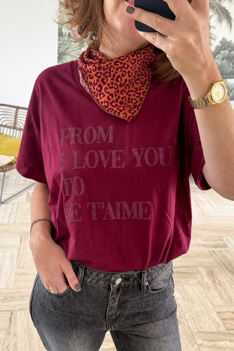 Le t-shirt Tara séduit par sa teinte bordeaux, couleur forte de la saison, et son doux message d’amour « From I love you to Je t’aime ». Une pièce qui apporte chaleur et poésie à vos looks.