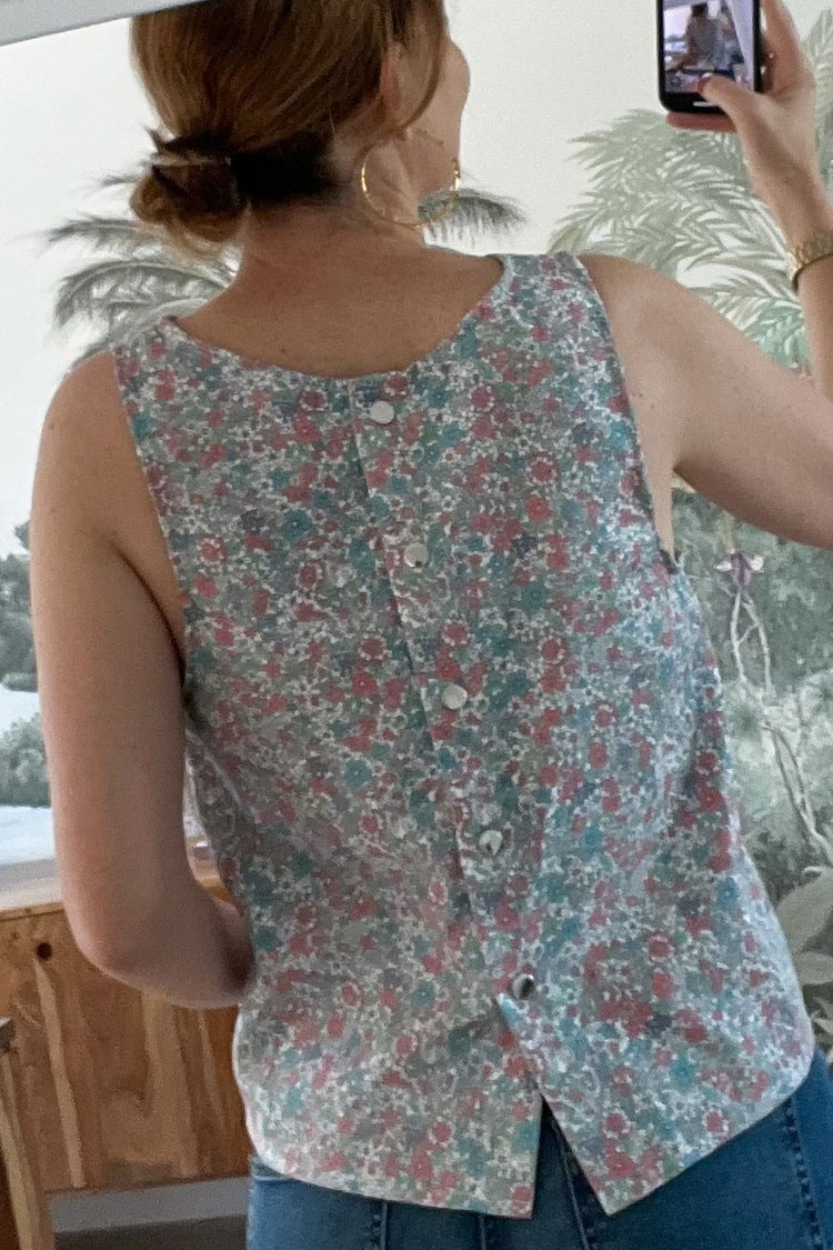 Le top Adèle à l'encolure ronde et à la forme débardeur dans un imprimé liberty très frais. Il est boutonné sur toute la longueur du dos. Associez-le au jean large Twiggy Wide et à la veste Alicia pour faire prolonger l'été dans votre dressing.