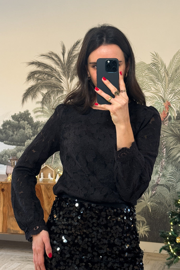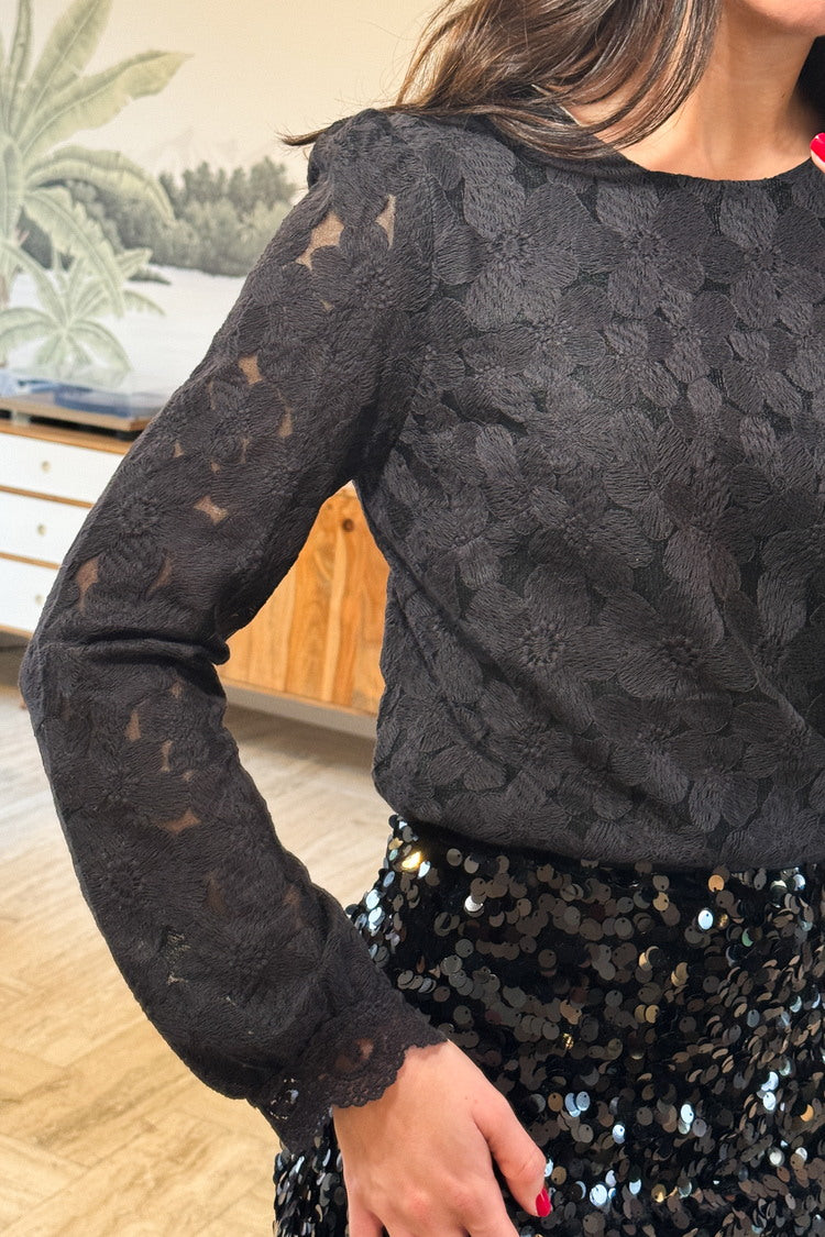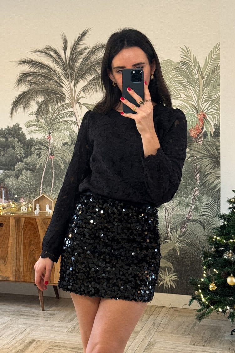 La tunique Jeanne, coup de cœur de la saison, se distingue par son tissu noir rehaussé de grandes fleurs brodées et ses manches longues sublimées par des jeux de transparence. Parfaite pour créer une tenue festive, elle s’associe idéalement avec la jupe à sequins noire Ambre.