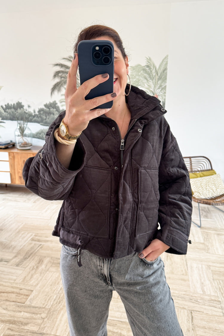 La veste Marshall adopte une coupe courte et oversize, parfaite pour un look moderne et décontracté. Son matelassage apporte confort et chaleur, tandis que ses grandes poches plaquées et sa double fermeture — zip et boutons-pression — lui donnent une touche urbaine et contemporaine. On aime son allure structurée et ses finitions soignées qui en font une pièce à la fois pratique et stylée. On l’associe avec le pull rouge Chuck et le jean boyfriend Yoday pour une silhouette actuelle et pleine de caractère.